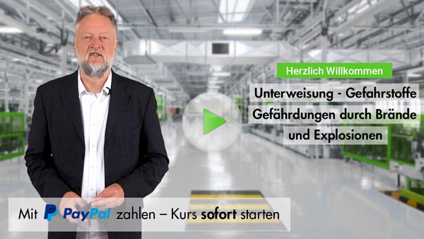 Diese E-Learning Unterweisung thematisiert die Brand- und Explosionsgefahr beim Umgang mit Gefahrstoffen. Unser Trainer vermittelt dabei die Inhalte dieser „Unterweisung Gefahrstoffe Brandgefahr“ online in verschiedenen Videos und gibt hierbei auch noch Tipps für die Praxis. Zudem können Sie das erlangte Wissen durch unterschiedliche Übungen festigen.